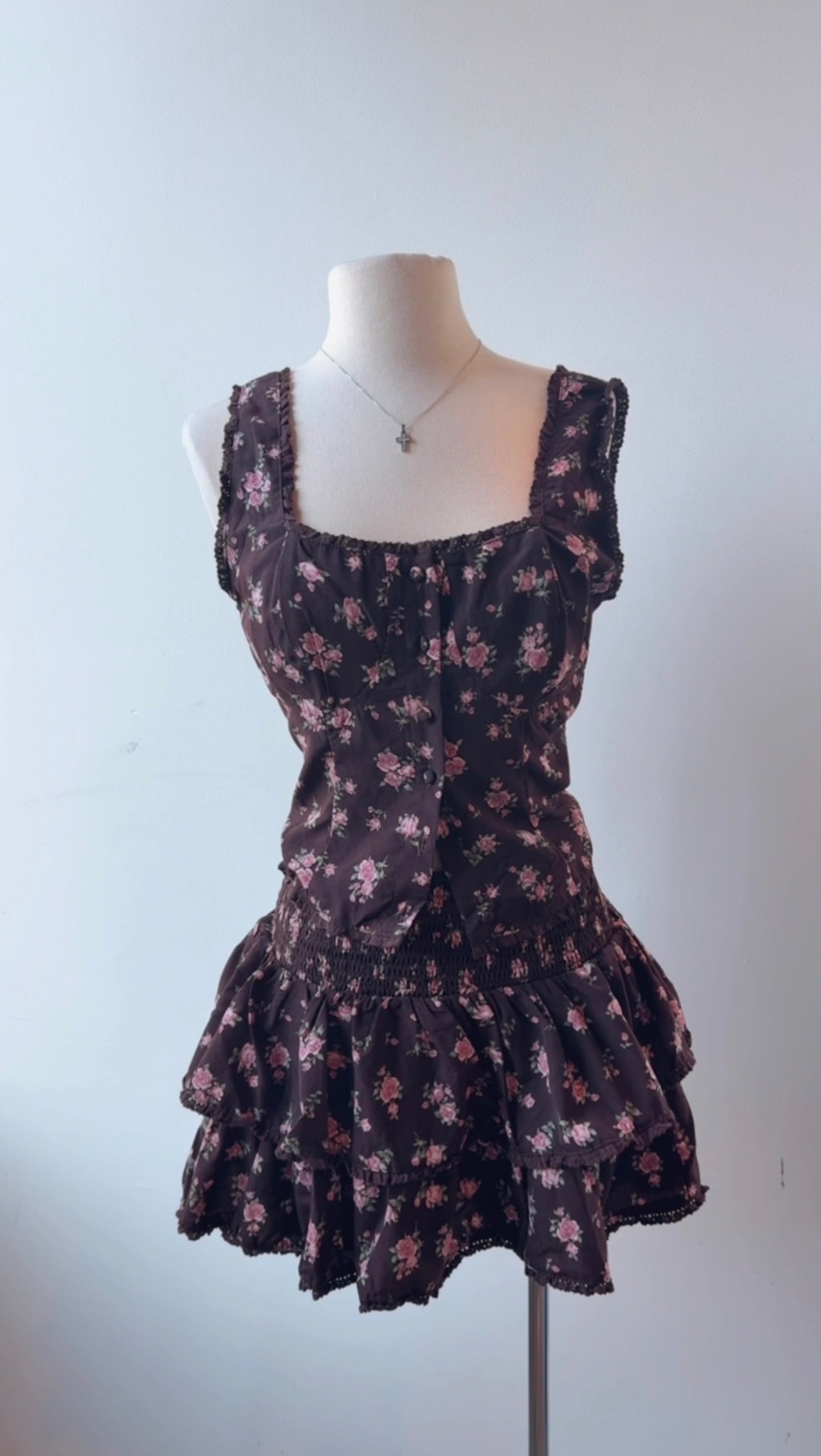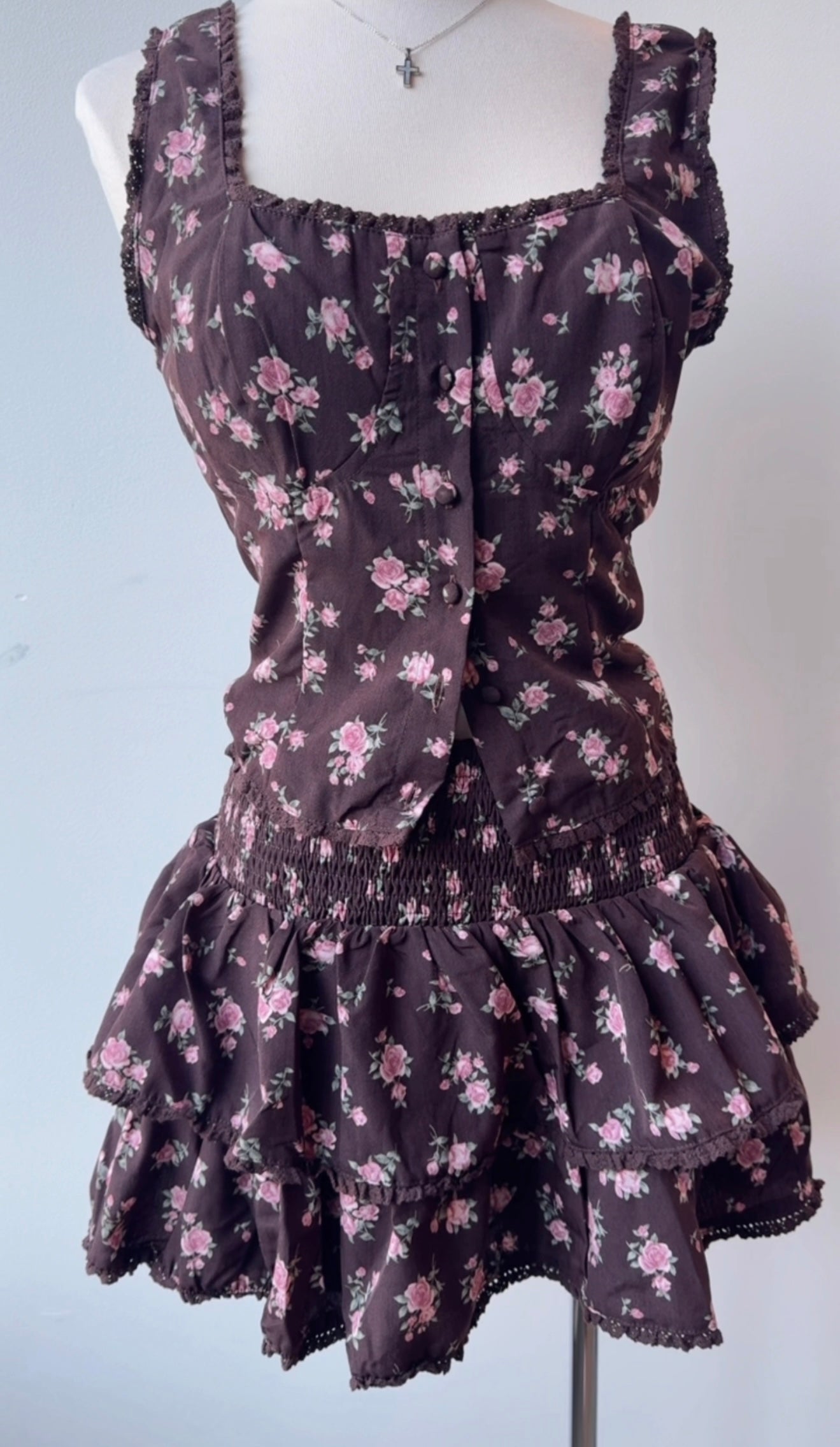 Flirty, romantic, and a little vintage-inspired ✨ This deep burgandy mini set features a delicate pink floral print that gives it the sweetest feminine touch. Designed with a soft square neckline, subtle lace trim, and front button detailing, it hugs beautifully at the waist before flowing into a layered ruffle skirt for the perfect playful finish.